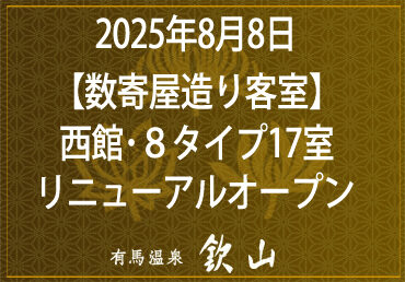 清潔な空間でお過ごしいただける “数寄屋造り客室” 8タイプ17室 令和7年8⽉8⽇リニューアルオープン