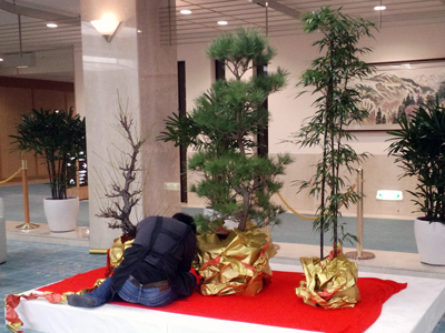 欽山でも長屋門に門松を飾り、ロビーでは松竹梅を準備中…。