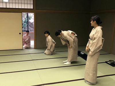 当館では、小笠原秀邦家元詞に、襖の開け閉めや、お辞儀の仕方、お茶の出し方などの