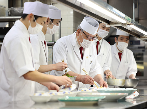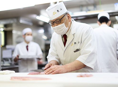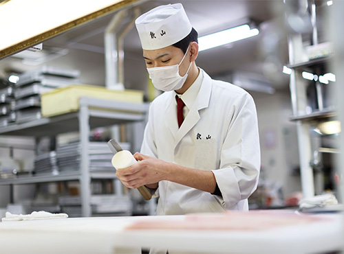 お客様の夕食時間に合わせ、それぞれのお部屋のお料理出しがスタートします。 八寸場・板場・煮方とポジションごとに時間を合わせ、お料理をお出ししていきます。
